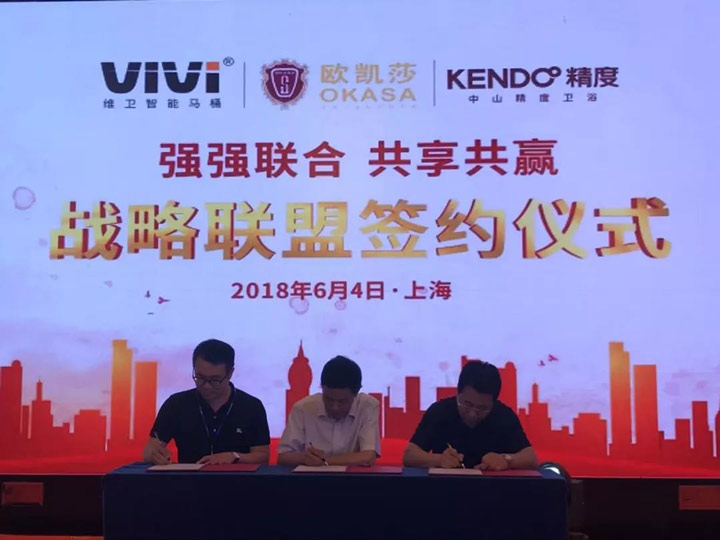 2018年6月4日,歐凱莎浴室柜、維衛(wèi)智能馬桶、精度淋浴房在上;释⑹兰o(jì)酒店舉行戰(zhàn)略聯(lián)盟簽約儀式,正式達(dá)成戰(zhàn)略合作。