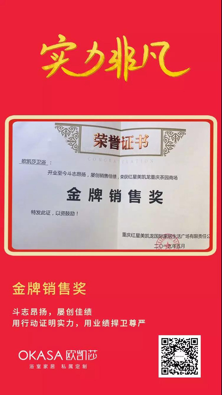 5月5日,紅星美凱龍重慶商場銷售評選活動正式舉辦,歐凱莎衛(wèi)浴憑借穩(wěn)健的銷售與運營實力,在數(shù)百家門店中脫穎而出,榮獲“金牌銷售獎”!