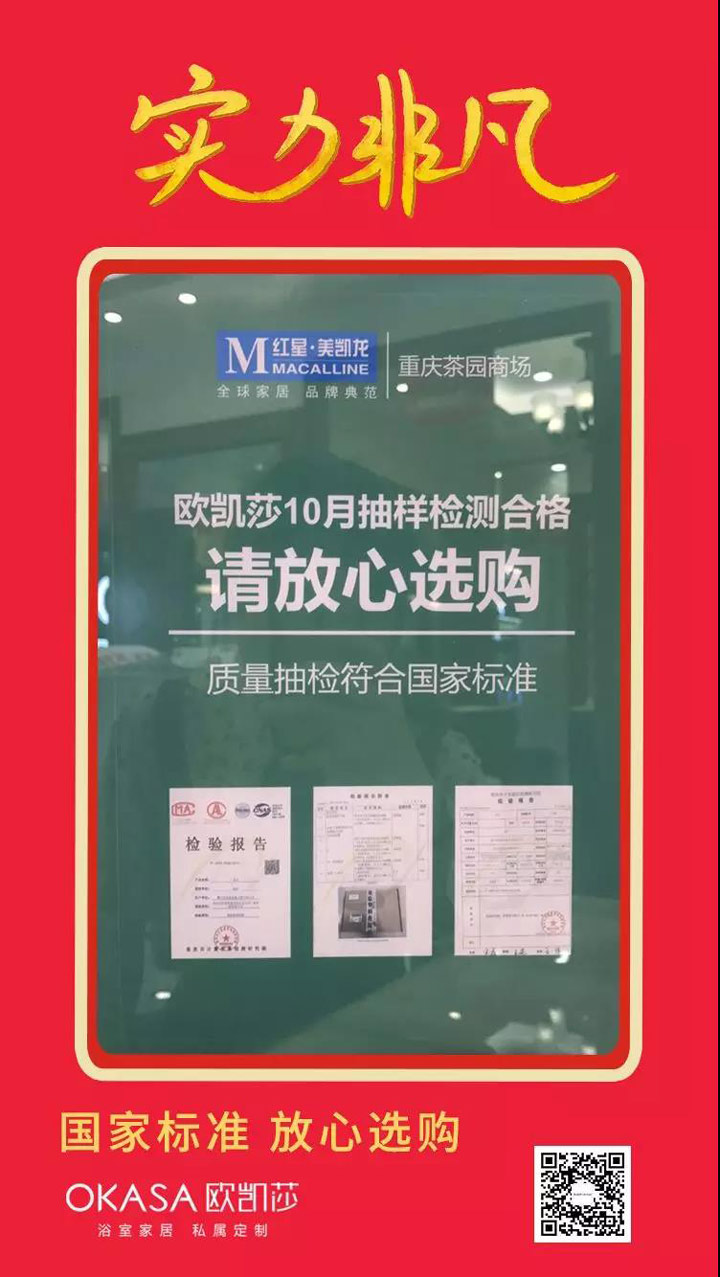 在紅星美凱龍品質(zhì)抽檢活動中,歐凱莎浴室柜順利通過檢驗,品質(zhì)符合并超過國家標(biāo)準(zhǔn)。歐凱莎所有木材均來自國外進(jìn)口,油漆采用臺灣大寶環(huán)保油漆,對人體無危害。