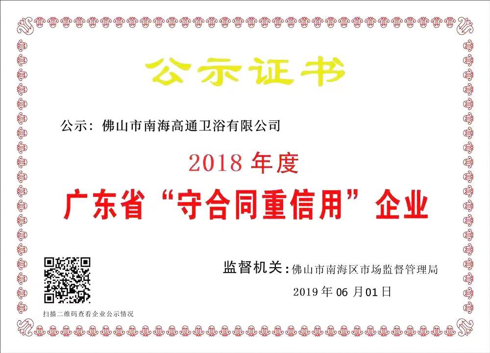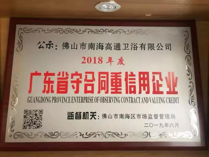 佛山市南海高通衛(wèi)浴有限公司獲得年度“廣東省守合同重信用企業(yè)”榮譽(yù)稱號(hào),